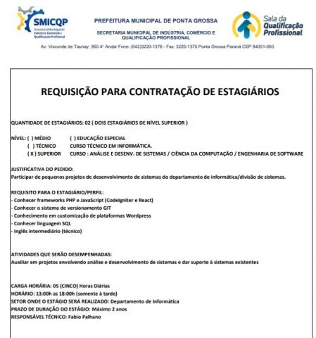 Segue requisição de contratação de estagiários na Prefeitura Municipal de Ponta Grossa. Interessados analisar documento anexo,