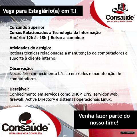 Interessados em estagiar na operadora de Plano de Saúde - CONSAUDE, favor verificar o documentos anexo e enviar currículo para curriculo@consaude.com com o assunto "Vaga: Estágio - T.I."